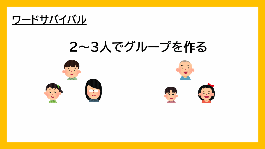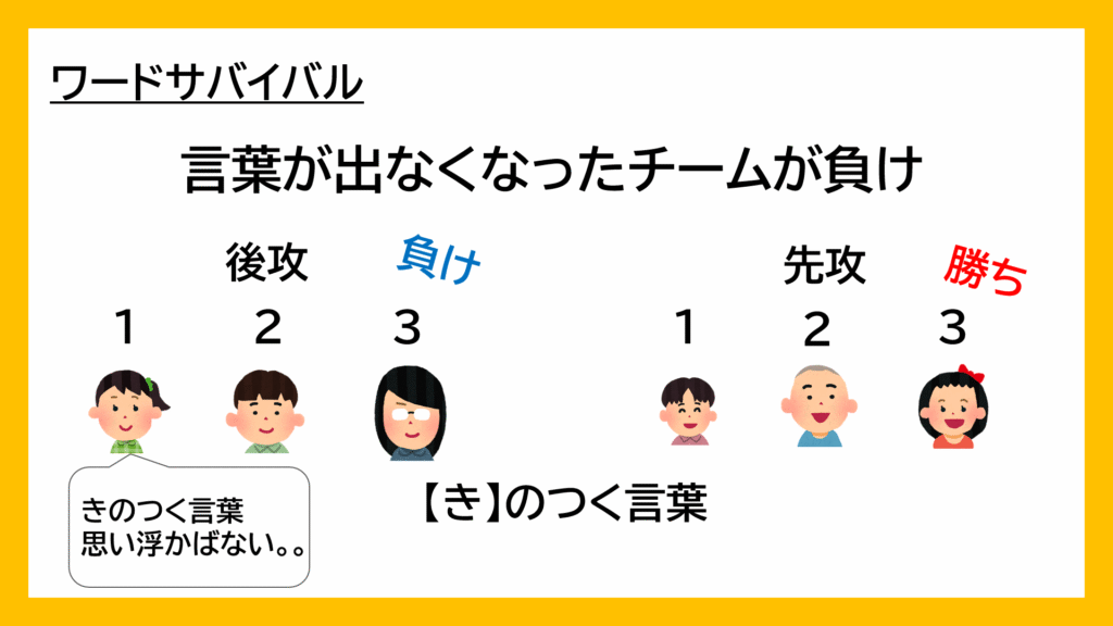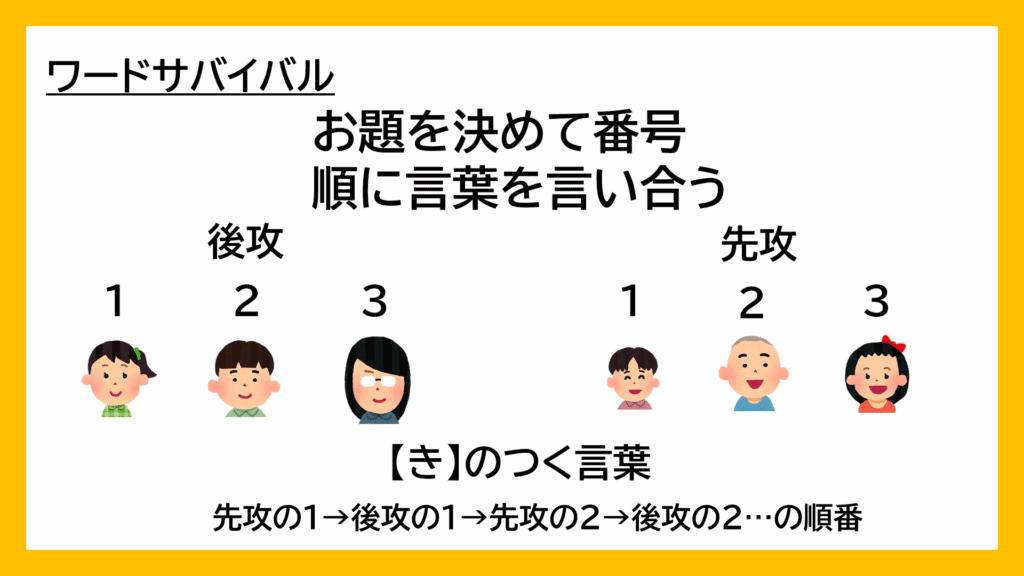 【保育】【学童】 室内遊び☆ワードサバイバル 室内遊び X Facebook はてブ Pocket LINE コピー 2025.10.05 保育園や学童で使える室内遊びを紹介この記事では【ワードサバイバル】を紹介します 目次 【ワードサバイバル】共有: 【ワードサバイバル】 共有:FacebookX